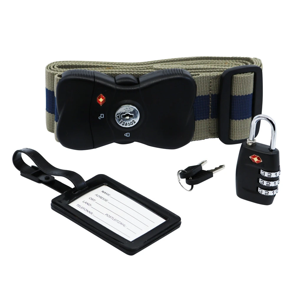 Ajustable de 105 à 195 cm x5 cm (sangle) – 6,3 x 3 x 1,4 cm (cadenas) + 7,5 x 5 cm (étiquette)