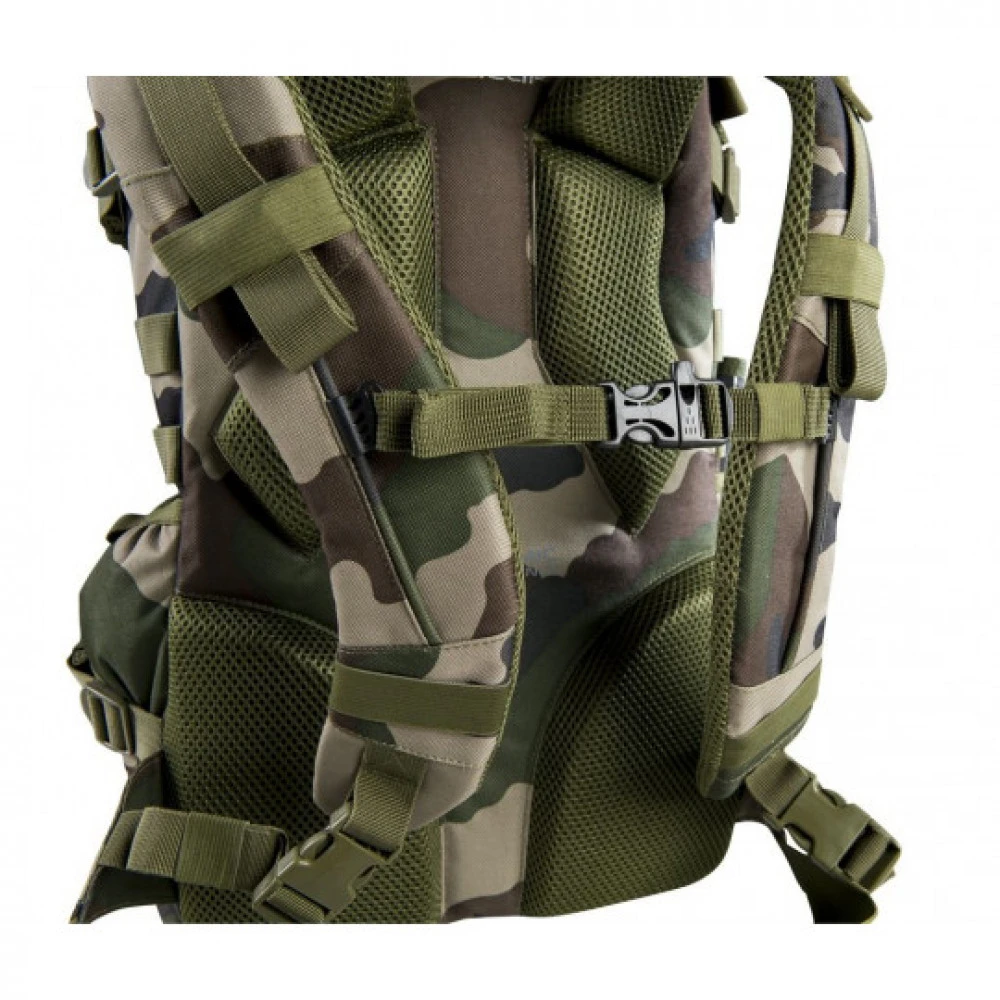 - Sangles pectorale (réglable en hauteur avec sifflet d’alerte), ventrale et de compression